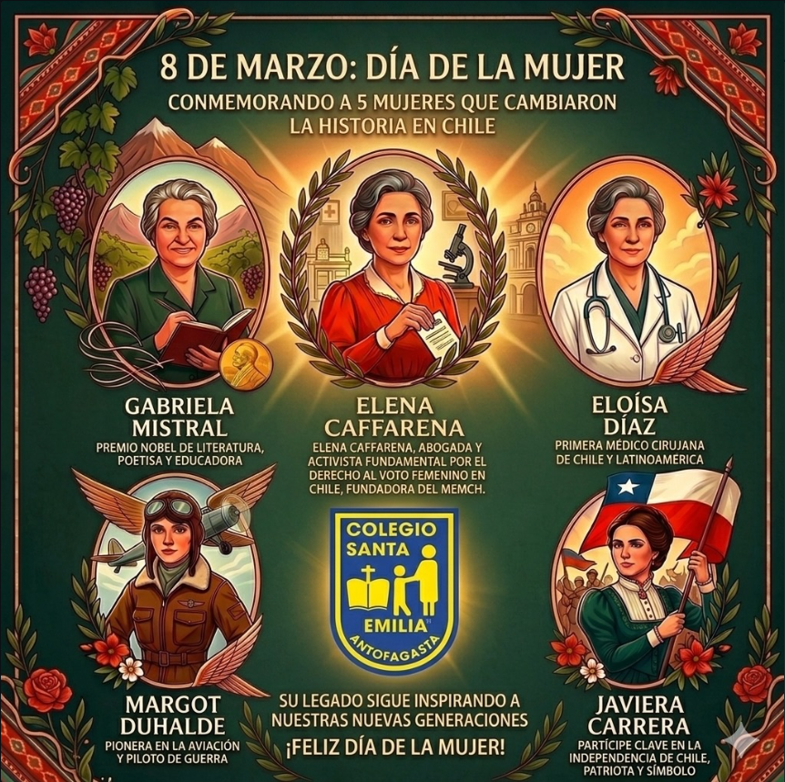 En el Colegio Santa Emilia, nos unimos a la conmemoración del Día Internacional de la Mujer recordando a cinco pioneras que, con valentía y determinación, transformaron la historia de Chile y abrieron caminos para todas las generaciones que vinieron después.