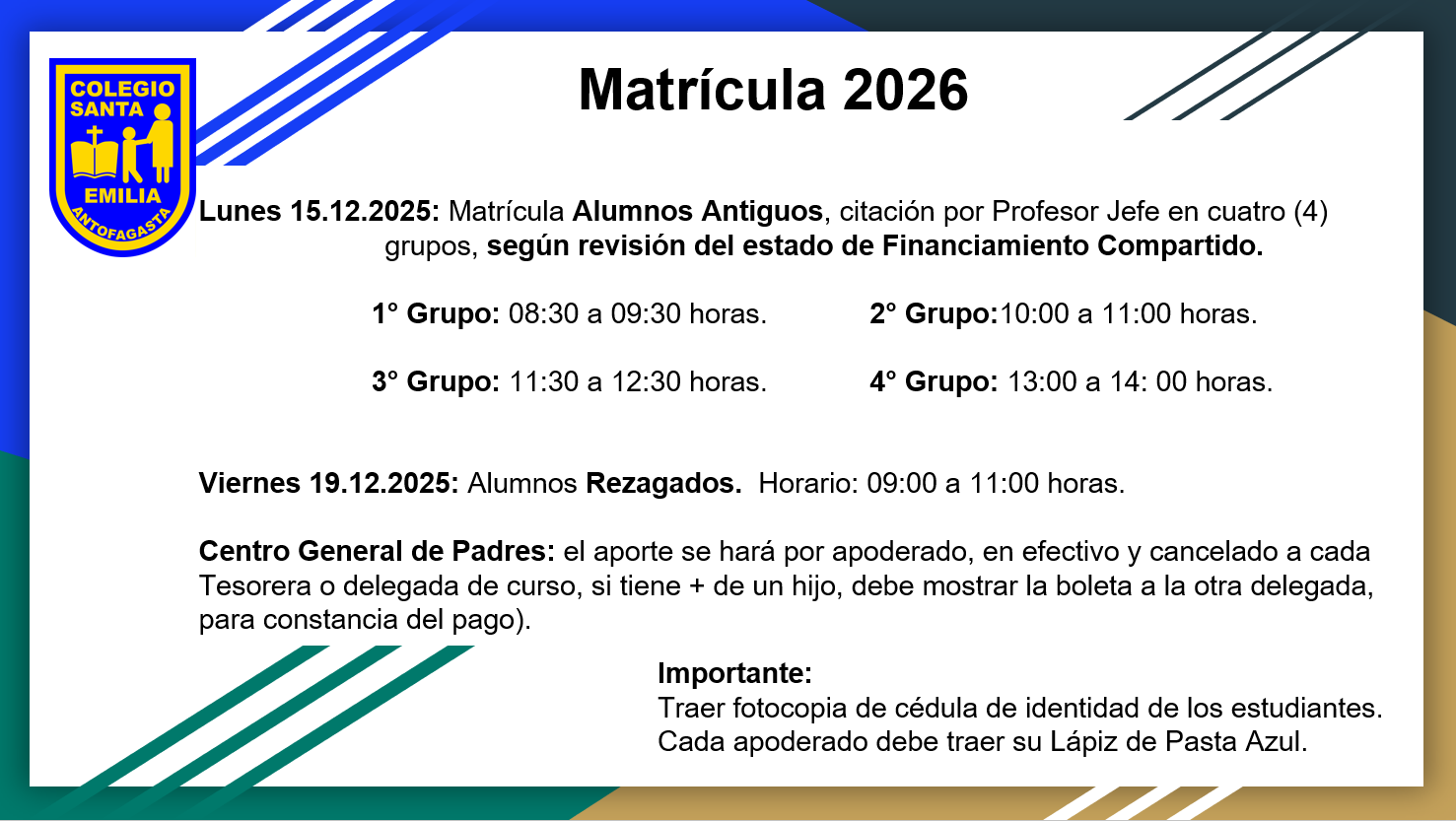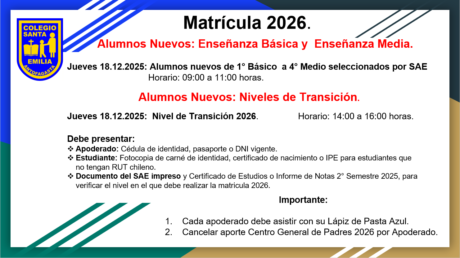 Horarios de atenciónOficina de partesLunes a viernesMañana: 09:40 – 12:00Tarde: 13:45 - 16:30Entrevistas con docentesLunes: 18:15 - 19:15Manuel Silva #1014 Mail: info@colegiosantaemilia.clfono: (55) 2295065